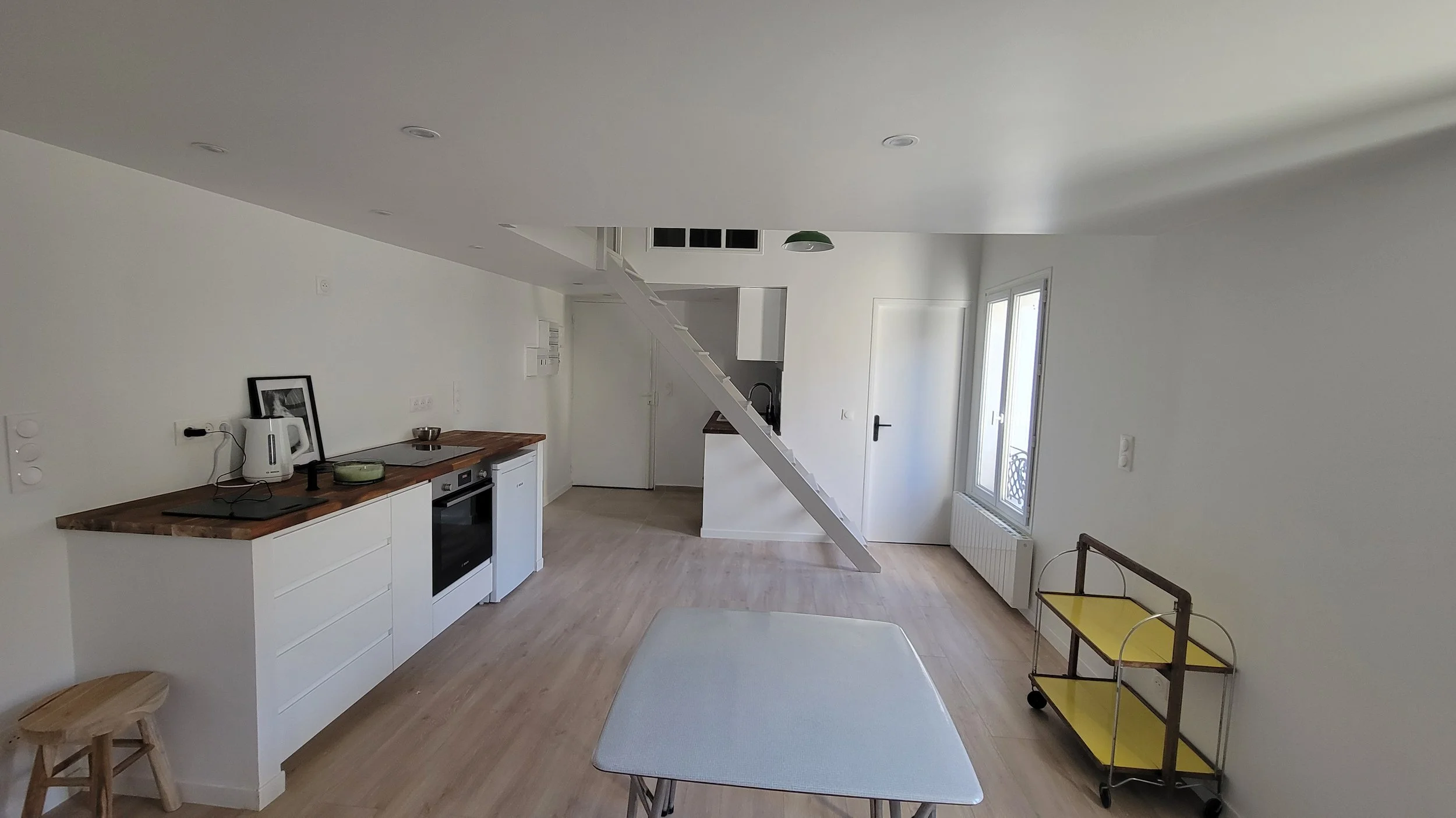 Situé dans une petite cour calme avec atelier d’artiste, ce duplex d’une cinquantaine de mètres carrés disposait d’un fort potentiel, mais présentait plusieurs contraintes : une circulation peu fluide, une cuisine mal optimisée avec l’évier dès l’entrée puis, plus loin, four et plaques de cuisson, ainsi qu’un escalier trop étroit menant à l’espace nuit.
