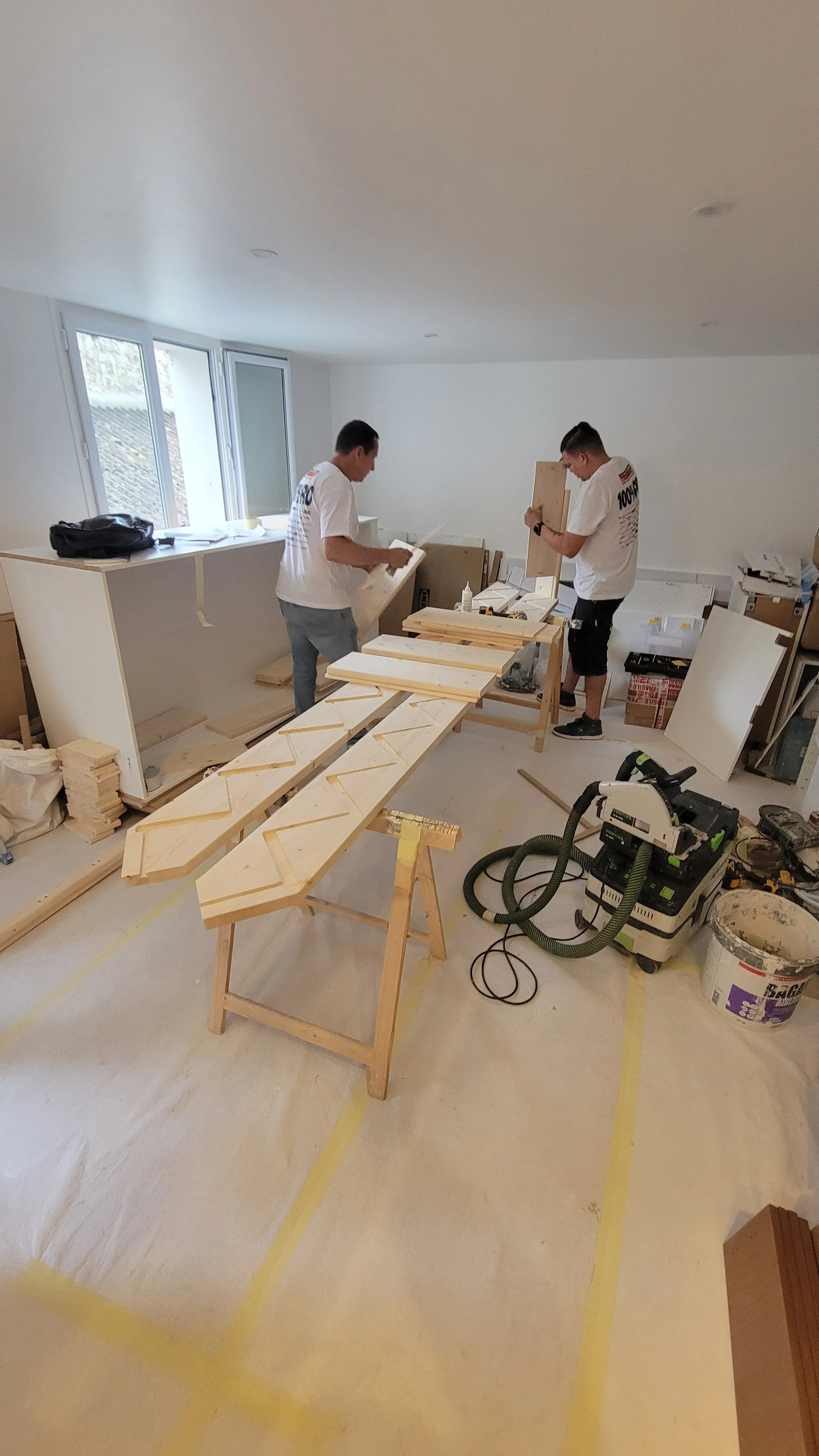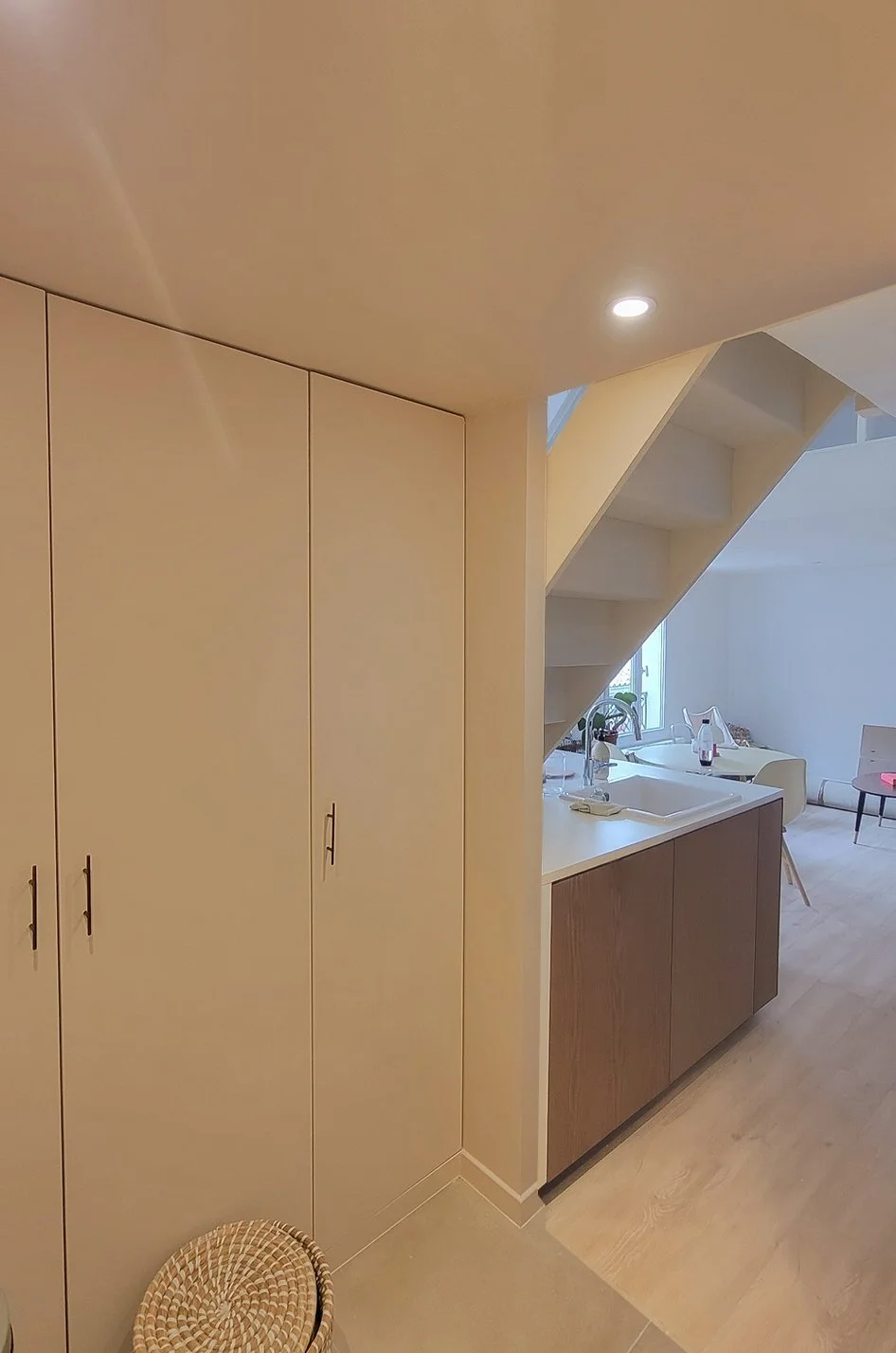 Nous avons donc entièrement repensé l’aménagement : création d’une véritable entrée avec rangements intégrés, conception d’un escalier sur mesure, à la fois plus confortable et esthétique, et réalisation d’une cuisine cohérente avec la nouvelle organisation des volumes.